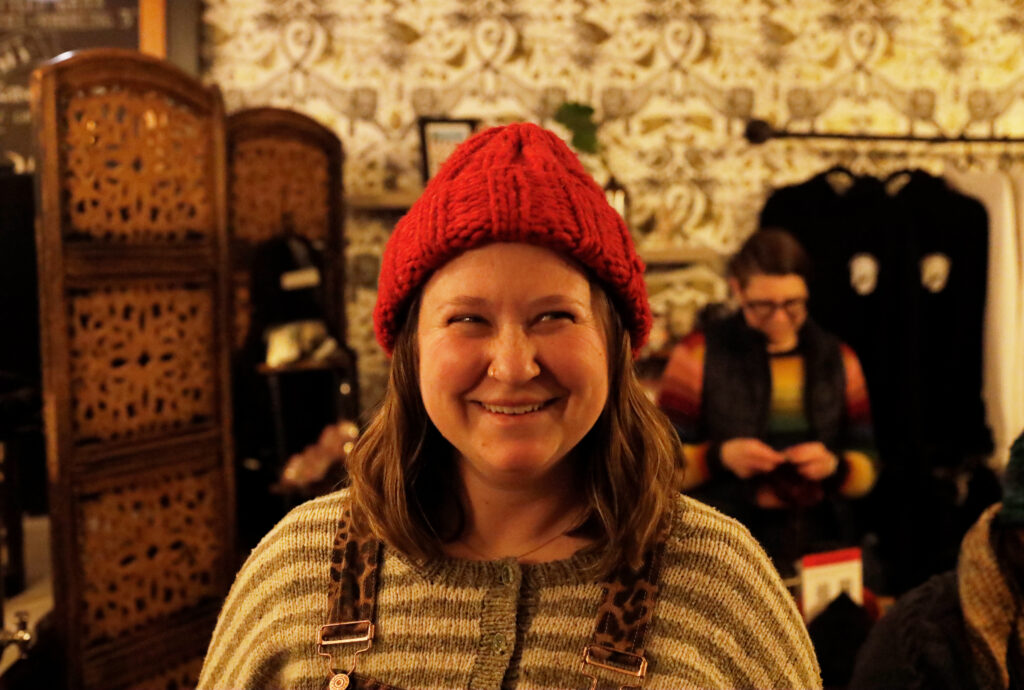 The red resistance hat anchoring the gathering carries a specific lineage. Taking inspiration from hats worn during Norway’s World War II resistance, Bonetti said this pattern has reemerged in response to ICE’s presence in Minnesota, where proceeds from the design support communities directly impacted.