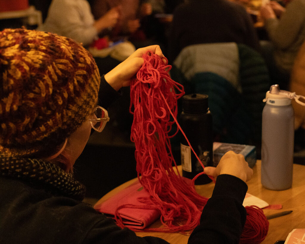 Twenty percent of yarn and tool sales from The Dropped Stitch and a portion of café sales were donated, while additional contributions went directly to the two immigration-rights organizations, according to Bonetti. A raffle for a knitting class rounded out the fundraising, keeping the structure informal and accessible. Rather than centering speeches or formal programming, the event allowed the space, the symbol and the conversations to do the work.